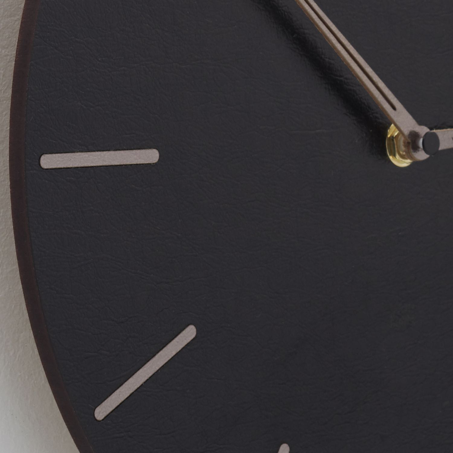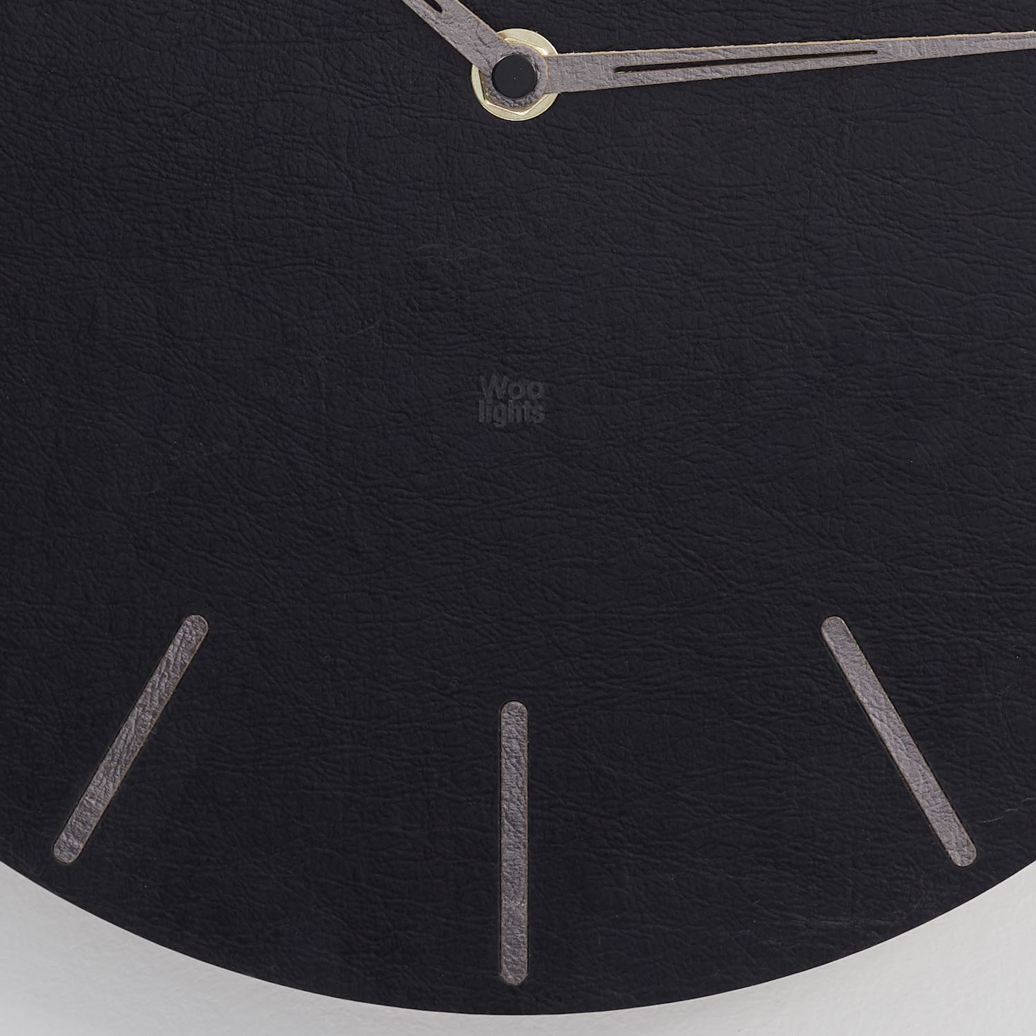 Tarcza tego nowoczesnego zegara wykonana jest z płyty MDF pokrytej ekologicznym posiadającym certyfikat FSC włóknem celulozowym. Czarna tarcza jest lekko błyszcząca i ma fakturę skóry. Srebrne wąskie prostokąty znaczników godzin mają zaokrąglone końcówki. Wskazówki zegara również są srebrne, a ich smukły kształt doskonale uzupełnia całość minimalistycznej formy. Zegar jest wyposażony w wysokiej jakości cichy i precyzyjny mechanizm kwarcowy.